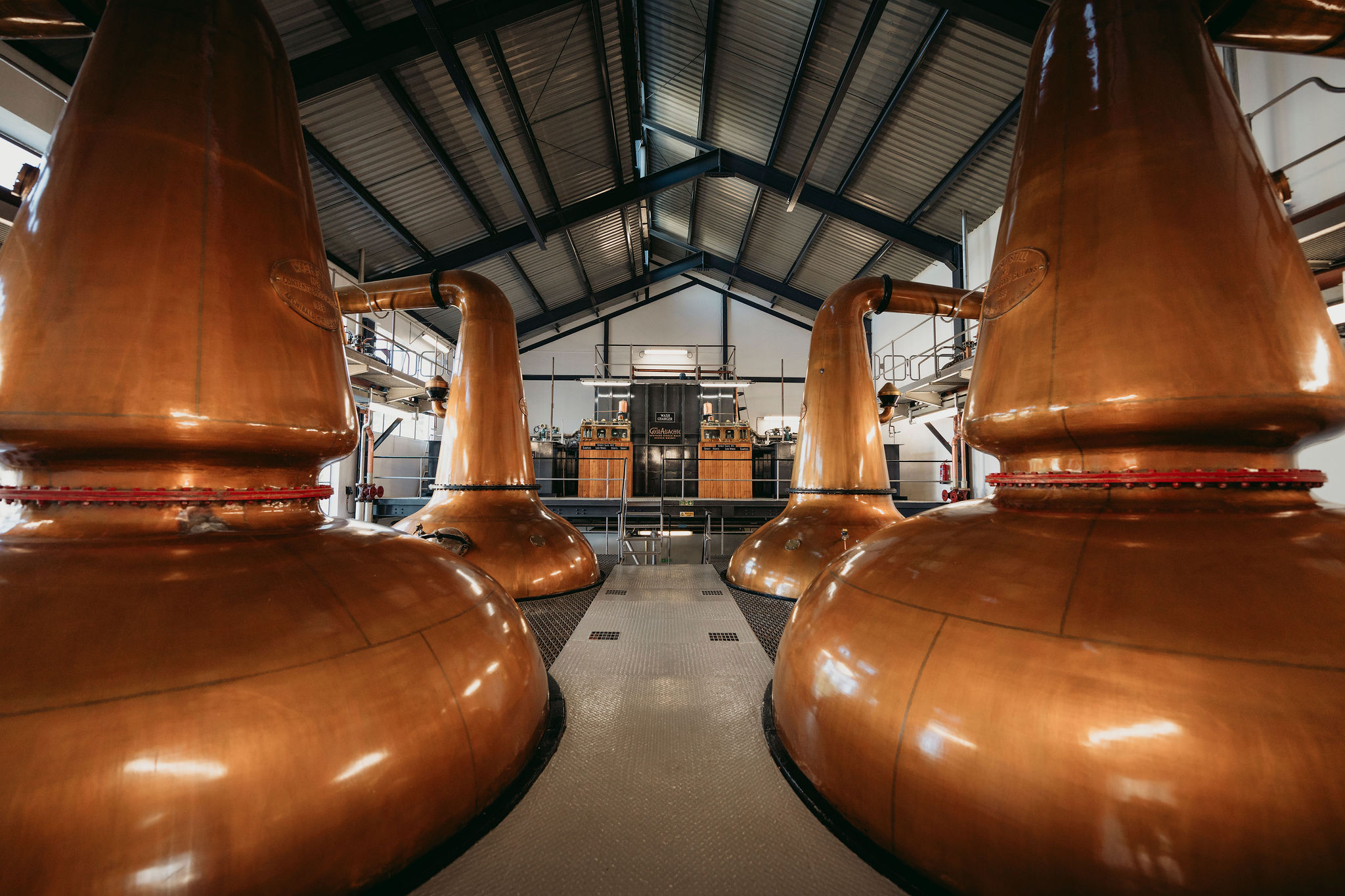 A Destilaria possui dois pares de Alambiques tipo Pot Still, sendo cada par de um formato diferente.